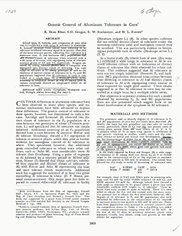 Subject(s): In: Crop Science United States of America : John Wiley & Sons, 1978. v. 18, no. 6, p. 1063-1067Summary: Inbred lines, F1 hybrids, and composites of corn (Zea may L.) exhibited a wide range in tolerance to aluminum. F1 hybrids obtained from inbred lines differing in A1 tolerance exhibited tolerance equal to or greater than that of the more tolerant parent, indicating that tolerance is a dominant trait. F2 and backcross (BC) populations had two distinct classes of tolerance when screened over a wide range of AI stress, with segregating ratios of tolerant: sensitive plants of 3:1 and 1:1, respectively. Progeny obtained by selling tolerant plants from a composite also segregated into distinct classes of tolerance. The wide range in tolerance to AI among genotypes as well as the existence of distinct classes of tolerance in S1, F2, and BC populations suggested that AI tolerance in corn is controlled at a single locus by a multiple allelie series. Screening of reciprocal crosses as well as inbred lines in various cytoplasms showed no cytoplasmic affect on A1 tolerance in corn.