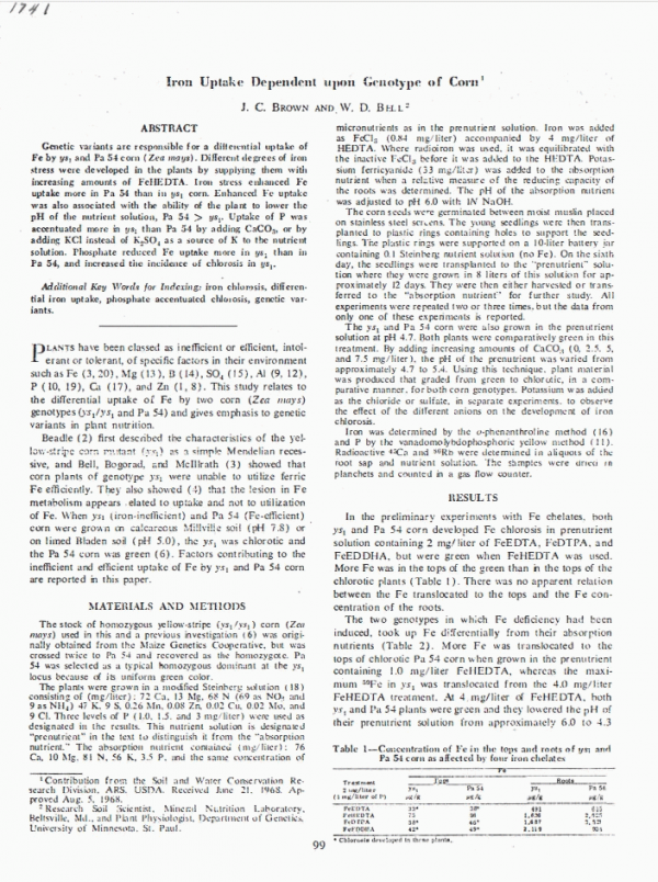 Iron uptake dependent upon genotype of corn