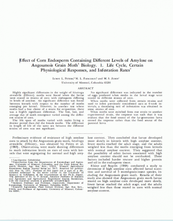 Highly significant differences in the weight of Sitotroga cerealella (Olivier) moths were found when the larvae were reared in strains of corn with endosperm differing in levels of amylose. No significant difference was found between kernels with respect to the number of moths emerging per kernel. However, in another test where moths had a free choice of a strain for oviposition, there was a highly significant difference. The first, last, and average day of moth emergence varied among the different strains of corn. The life span of moths varied with males living a shorter period than did the female moths. The difference in length of life of the same sex between the different strains of corn was not significant. No significant difference was indicated in the number of eggs produced when moths in the larval stage were reared in different strains of corn. When moths were collected from certain strains and used to infest previously non infested cars at 6-week intervals, a decreasing rate of infestation was obtained in some strains of corn. When moths were switched from one strain to another experimental strain, the response was such that it was evident that the food source of the 1st-generation larva caused the response rather than the food source of the parental larva.