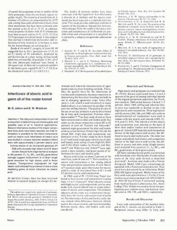 The fatty acid composition of corn oil is important in determining nutritional quality and possible uses of oil in industrial applications. Several inheritance studies of the major component fatty acids have been reported, but little information is available for the minor components such as stearic acid. Inheritance of stearic acid was studied in crosses between standard inbred lines with approximately 2 percent stearic acid and three strains of an introduced genotype (PI 175334) with unusually high stearic acid of about 10 percent. Results from single kernel oil analyses of the parents, F1, F2, BC1, and BC2 generations strongly suggest involvement of a major single gene recessive for high stearic acid in these crosses. Transgressive segregation for high stearic acid indicated the presence of one or more modifying genes of minor influence on stearic acid.