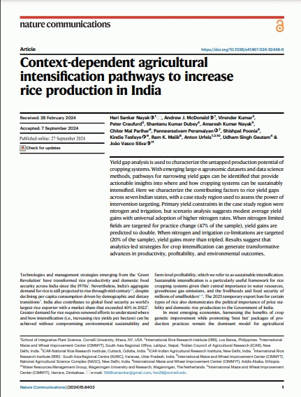 Subject(s): Online resources: In: Nature Communications London (United Kingdom) : Nature Publishing Group, 2024. v. 15, art. 8403Summary: Yield gap analysis is used to characterize the untapped production potential of cropping systems. With emerging large-n agronomic datasets and data science methods, pathways for narrowing yield gaps can be identified that provide actionable insights into where and how cropping systems can be sustainably intensified. Here we characterize the contributing factors to rice yield gaps across seven Indian states, with a case study region used to assess the power of intervention targeting. Primary yield constraints in the case study region were nitrogen and irrigation, but scenario analysis suggests modest average yield gains with universal adoption of higher nitrogen rates. When nitrogen limited fields are targeted for practice change (47% of the sample), yield gains are predicted to double. When nitrogen and irrigation co-limitations are targeted (20% of the sample), yield gains more than tripled. Results suggest that analytics-led strategies for crop intensification can generate transformative advances in productivity, profitability, and environmental outcomes.