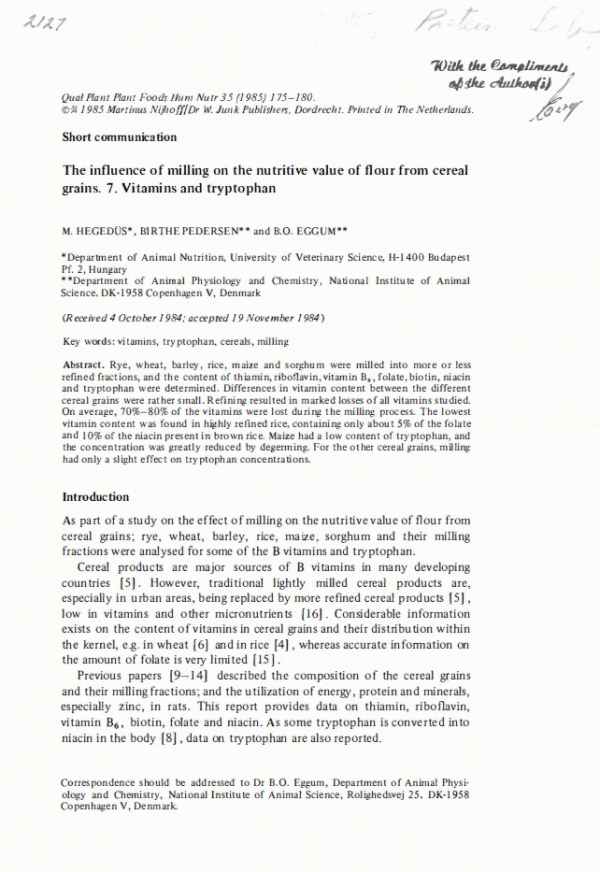 The influence of milling on the nutritive value of flour from cereal grains. 7. Vitamins and tryptophan