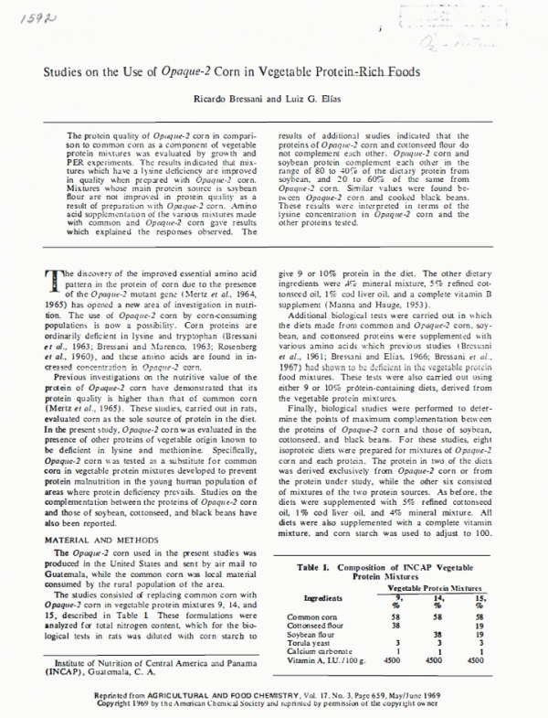 The protein quality of Opaque-2 corn in comparison to common corn as a component of vegetable protein mixtures was evaluated by growth and PER experiments. The results indicated that mixtures which have a lysine deficiency are improved in quality when prepared with Opaque-2 corn. Mixtures whose main protein source is soybean flour are not improved in protein quality as a result of preparation with Opaque-2 corn. Amino acid supplementation of the various mixtures made with common and Opaque-2 corn gave results which explained the responses observed. The results of additional studies indicated that the proteins of Opaque-2 corn and cottonseed flour do not complement each other. Opaque-2 corn and soybean protein complement each other in the range of 80 to 40% of the dietary protein from soybean, and 20 to 60% of the same from Opaque-2 corn. Similar values were found between Opaque-2 corn and cooked black beans. These results were interpreted in terms of the lysine concentration in Opaque-2 corn and the other proteins tested.
