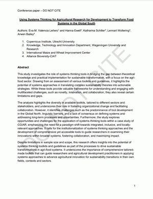 TextLanguage: English Publication details: [Place of publication not identified] : Utrecht University : Wageningen University and Research : CIMMYT : Alliance Bioversity-CIAT, 2024.Description: 28 pagesSubject(s): Online resources: Summary: This study investigates the role of systems thinking tools in bridging the gap between theoretical knowledge and practical implementation for sustainable transformation, with a focus on the agri-food sector. Drawing from an assessment of various toolkits and guidelines, it highlights the potential of systems approaches in translating complex sustainability theories into actionable strategies. While these tools provide valuable frameworks for understanding and engaging with multifaceted challenges, such as novelty, innovation, and collaboration, they also reveal certain limitations and gaps. The analysis highlights the diversity in available toolkits, tailored to different sectors and stakeholders, and underscores their role in fostering organizational change and facilitating collaboration. However, it identifies challenges such as the predominance of tool development in the Global North, linguistic barriers, and a lack of consensus on defining systems and addressing long-term processes and uncertainties. Furthermore, the study explores opportunities and challenges for the application of systems thinking tools within a case study of CGIAR, emphasizing the need for a paradigm shift towards integrated, inclusive, and locally-relevant approaches. It calls for the institutionalization of systems thinking approaches and the development of comprehensive yet accessible tools to guide researchers in examining their innovations within broader systems, fostering collaboration, and maximizing impact. Despite limitations in sample size and scope, this research offers insights into the potential of systems thinking toolkits and guidelines as part of the processes to drive sustainable transformations in agri-food systems. It underscores the importance of comprehensive tailored-made toolkits that can guide researchers and agricultural development practitioners in applying systems approaches to advance agricultural innovation for sustainability transitions in their own fields, contexts and sectors.