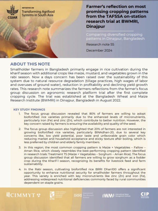 Smallholder farmers in Bangladesh primarily engage in rice cultivation during the kharif season with additional crops like maize, mustard, and vegetables grown in the rabi season. Now a days concern has been raised over the sustainability of this system due to natural resource degradation (tillage practices, high wages of labor and overuses of ground water), reduction in profitability and declining yield growth rates. This research note summarizes the farmers reflections from the farmer’s focus group discussion on agronomic research platform trial after the first complete cropping cycle. The trial was established at the Bangladesh Wheat and Maize Research Institute (BWMRI) in Dinajpur, Bangladesh in August 2022.
