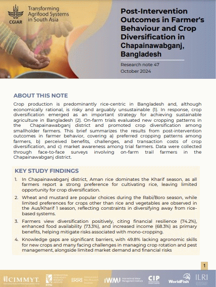 Crop production is predominantly rice-centric in Bangladesh and, although economically rational, is risky and arguably unsustainable (1). In response, crop diversification emerged as an important strategy for achieving sustainable agriculture in Bangladesh (2). On-farm trials evaluated new cropping patterns in the Chapainawabganj district and promoted crop diversification among smallholder farmers. This brief summarizes the results from post-intervention outcomes in farmer behavior, covering a) preferred cropping patterns among farmers, b) perceived benefits, challenges, and transaction costs of crop diversification, and c) market awareness among trial farmers. Data were collected through face-to-face surveys involving on-farm trail farmers in the Chapainawabganj district.