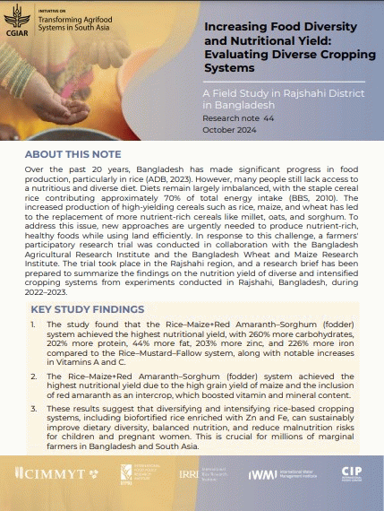 This research brief presents findings on the nutritional yield (NY) of macro and micronutrients from various cropping system options. The studied systems included: Rice-Lentil-Sweet Corn, Rice-Maize intercropped with red amaranth and sorghum (as fodder), Rice-Mustard intercropped with sorghum and cowpea (as fodder), and the conventional Rice-Mustard-Fallow system. These systems were assessed to promote dietary diversity and healthier food options. The Rice-Mustard-Fallow system is traditionally followed by farmers, while the other three represent more intensive and diverse cropping alternatives. The study was carried out across 40 farmers' fields in two villages in the Rajshahi district of Bangladesh.