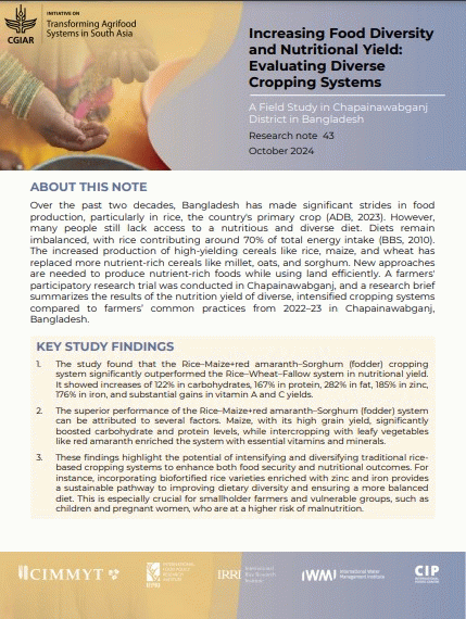 Over the past two decades, Bangladesh has made significant strides in food production, particularly in rice, the country's primary crop (ADB, 2023). However, many people still lack access to a nutritious and diverse diet. Diets remain imbalanced, with rice contributing around 70% of total energy intake (BBS, 2010). The increased production of high-yielding cereals like rice, maize, and wheat has replaced more nutrient-rich cereals like millet, oats, and sorghum. New approaches are needed to produce nutrient-rich foods while using land efficiently. A farmers' participatory research trial was conducted in Chapainawabganj, and a research brief summarizes the results of the nutrition yield of diverse, intensified cropping systems compared to farmers’ common practices from 2022–23 in Chapainawabganj, Bangladesh.