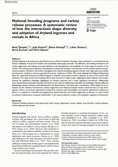 Subject(s): In: Outlook on Agriculture United Kingdom : SAGE Publications, 2025. v. 54, no. 1, p. 16-30Summary: Dryland legumes and cereals are a good food source in Africa's drylands. However, their production is constrained by the limited availability of improved varieties and sustainable seed supply channels. The efficiency of breeding institutions and variety registration and release processes influence crop development and availability of a wide range of varieties in the market. The entire process influences the adoption of improved varieties, crop diversity, and the overall resilience of agricultural systems. Therefore, this article investigates how national breeding programs interact with registration and release processes for varieties to improve agricultural systems’ resilience in Africa. This study adopted the Preferred Reporting Items for Systematic Reviews and Meta-Analyses to identify and examine previous research. A total of 63 articles were reviewed. The study found that breeding efforts have focused on staple crops, neglecting dryland legumes and cereals. Among the significant challenges highlighted are limited resources and a weak regulatory framework. Additionally, poor communication between breeders and farmers and a lack of reliable data intensifies the challenges. Despite different stakeholders being involved in seed development and dissemination, they have poor coordination, which delays the introduction of new varieties. Furthermore, variety registration and release processes remain critical barriers to crop development. Hence, to promote agricultural productivity, improve seed accessibility, and enhance agricultural resilience in Africa, it is essential to streamline early-generation seed production and variety registration processes. It is also critical to enhance collaboration among all stakeholders in the seed production system and strengthen regulatory frameworks.