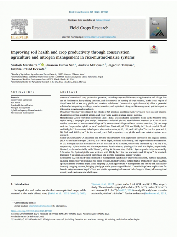 Context: Conventional crop production practices, including crop establishment using intensive soil tillage, low use of fertilization, low-yielding varieties, and the removal or burning of crop residues, in the Terai region of Nepal have led to low crop yields and nutrient imbalances. Conservation agriculture (CA) offers a potential solution by integrating no-tillage, residue retention, and optimized nitrogen (N) management, yet its impact in this region remains underexplored. Objectives: This study investigated the effects of CA practices combined with varying N rates on soil physicochemical properties, nutrient uptake, and crop yields in rice-mustard-maize- systems. Methodologies: A two-year field experiment (2011-2013) was conducted in farmers' fields in the Western Terai region using a strip-split plot design. Treatments included: (i) two establishment methods (CA: no-till with residue retention vs. conventional tillage (CT): conventional tillage without residue retention, (ii) two crop varieties (improved or hybrid vs. local), and (iii) four N rates (0, 60, 120, and 180 kg ha- 1 for rice and 0, 30, 60, and 90 kg ha- 1 for mustard in both years whereas for maize, 0, 60, 120, and 180 kg ha- 1 in the first year and 0, 80, 160, and 240 kg ha- 1 in the second year). Soil properties, crop yields, and crop nutrient uptake were assessed. Results and discussion: CA enhanced soil fertility and structure, with significant increase in soil organic carbon (15.4 %) and total nitrogen (14.6 %) at 0-10 cm depth, reduced bulk density, and improved moisture retention. In CA, Nitrogen uptake increased by 3 % in rice and 11 % in maize, while yield increased by 7 % and 9 %, respectively. Hybrid maize and rice outperformed local varieties, yielding 47 % and 3 % higher, respectively. Mustard performed variably, with 'Bikash' yielding 44 % more than 'Goldie'. System productivity increased by 5 % under CA. Optimal yields were achieved with 180 kg ha- 1 for rice and maize and 90 kg ha- 1 for mustard. Increased N application reduced barrenness and sterility percentage across varieties. Conclusions: CA combined with optimized N management significantly improves soil health, nutrient dynamics, and crop productivity in intensive rice-based systems. Hybrid varieties exhibit higher productivity under CA than open-pollinated or inbred types. Thus, adopting CA with appropriate N management and variety can sustainably intensify cropping systems, bridging yield gaps while preserving soil health. These findings have implications for broader adoption across Nepal's Terai and similar agroecological zones of Indo-Gangetic Plains, addressing food security and environmental challenges.