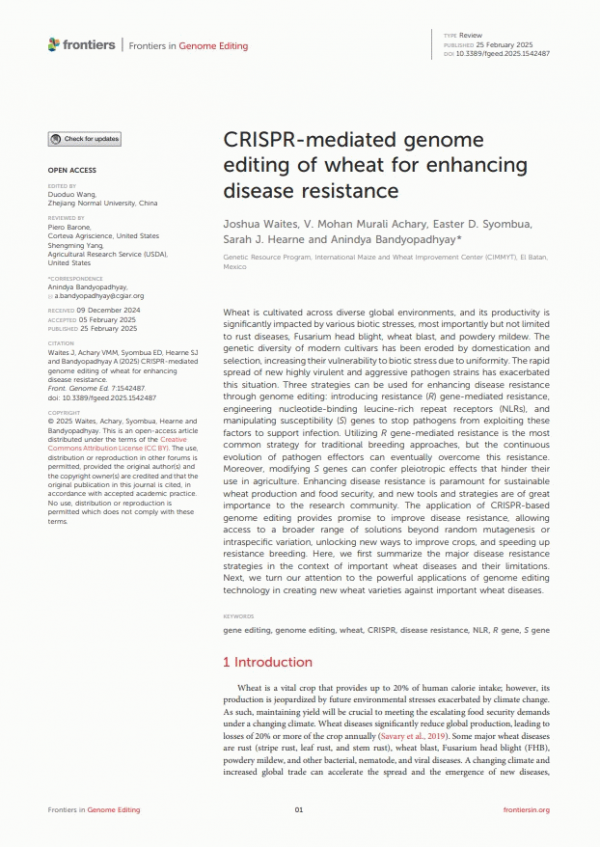 Subject(s): Online resources: In: Frontiers in Genome Editing Switzerland : Frontiers Media S.A., 2025. v. 7, art. 1542487Summary: Wheat is cultivated across diverse global environments, and its productivity is significantly impacted by various biotic stresses, most importantly but not limited to rust diseases, Fusarium head blight, wheat blast, and powdery mildew. The genetic diversity of modern cultivars has been eroded by domestication and selection, increasing their vulnerability to biotic stress due to uniformity. The rapid spread of new highly virulent and aggressive pathogen strains has exacerbated this situation. Three strategies can be used for enhancing disease resistance through genome editing: introducing resistance (R) gene-mediated resistance, engineering nucleotide-binding leucine-rich repeat receptors (NLRs), and manipulating susceptibility (S) genes to stop pathogens from exploiting these factors to support infection. Utilizing R gene-mediated resistance is the most common strategy for traditional breeding approaches, but the continuous evolution of pathogen effectors can eventually overcome this resistance. Moreover, modifying S genes can confer pleiotropic effects that hinder their use in agriculture. Enhancing disease resistance is paramount for sustainable wheat production and food security, and new tools and strategies are of great importance to the research community. The application of CRISPR-based genome editing provides promise to improve disease resistance, allowing access to a broader range of solutions beyond random mutagenesis or intraspecific variation, unlocking new ways to improve crops, and speeding up resistance breeding. Here, we first summarize the major disease resistance strategies in the context of important wheat diseases and their limitations. Next, we turn our attention to the powerful applications of genome editing technology in creating new wheat varieties against important wheat diseases.