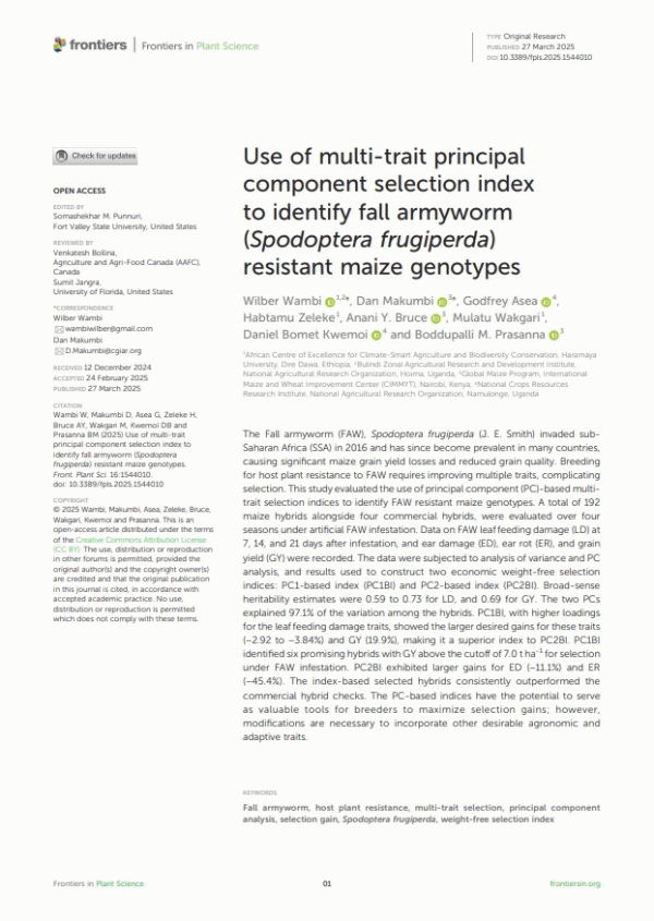 Subject(s): Online resources: In: Frontiers in Plant Science Switzerland : Frontiers Media, 2025. v. 16, art. 1544010Summary: The Fall armyworm (FAW), Spodoptera frugiperda (J. E. Smith) invaded sub-Saharan Africa (SSA) in 2016 and has since become prevalent in many countries, causing significant maize grain yield losses and reduced grain quality. Breeding for host plant resistance to FAW requires improving multiple traits, complicating selection. This study evaluated the use of principal component (PC)-based multi-trait selection indices to identify FAW resistant maize genotypes. A total of 192 maize hybrids alongside four commercial hybrids, were evaluated over four seasons under artificial FAW infestation. Data on FAW leaf feeding damage (LD) at 7, 14, and 21 days after infestation, and ear damage (ED), ear rot (ER), and grain yield (GY) were recorded. The data were subjected to analysis of variance and PC analysis, and results used to construct two economic weight-free selection indices: PC1-based index (PC1BI) and PC2-based index (PC2BI). Broad-sense heritability estimates were 0.59 to 0.73 for LD, and 0.69 for GY. The two PCs explained 97.1% of the variation among the hybrids. PC1BI, with higher loadings for the leaf feeding damage traits, showed the larger desired gains for these traits (-2.92 to -3.84%) and GY (19.9%), making it a superior index to PC2BI. PC1BI identified six promising hybrids with GY above the cutoff of 7.0 t ha-1 for selection under FAW infestation. PC2BI exhibited larger gains for ED (-11.1%) and ER (-45.4%). The index-based selected hybrids consistently outperformed the commercial hybrid checks. The PC-based indices have the potential to serve as valuable tools for breeders to maximize selection gains; however, modifications are necessary to incorporate other desirable agronomic and adaptive traits.