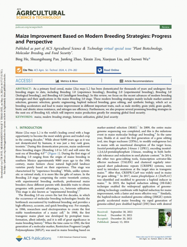 Subject(s): In: ACS Agricultural Science & Technology United States of America : American Chemical Society, 2025. v. 4, no. 3, p. 274–282Summary: As a primary food cereal, maize (Zea mays L.) has been domesticated for thousands of years and undergoes four breeding stages to date, including Breeding 1.0 (experience breeding), Breeding 2.0 (experimental breeding), Breeding 3.0 (biological breeding), and Breeding 4.0 (intelligent breeding). In this review, we focus on the recent advances of modern breeding strategies and their applications in the maize Breeding 3.0 stage. These modern breeding strategies mainly include marker-assisted selection, genomic selection, genetic engineering, haploid induced breeding, gene editing, and synthetic biology, which act as breeding accelerators and lead to maize improvement in different important traits, such as male sterility, grain yield, grain quality, biotic and abiotic stress resistance, and nitrogen use efficiency. Furthermore, we also propose several promising breeding strategies in the next era of Breeding 4.0, which will improve maize production greatly for ensuring global food security.