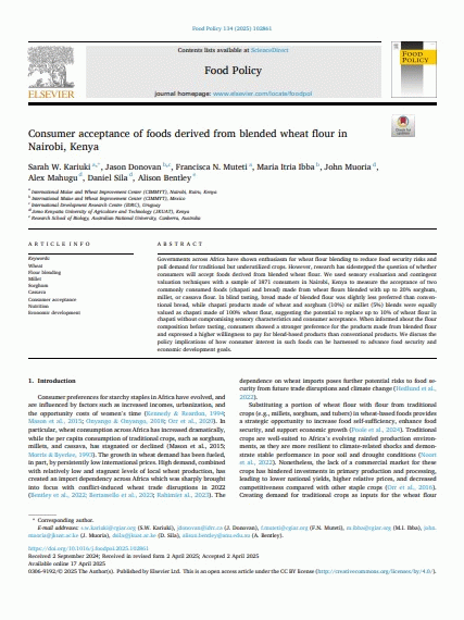 Subject(s): Online resources: In: Food Policy United Kingdom : Elsevier Ltd, 2025. v. 134, art. 102861Summary: Governments across Africa have shown enthusiasm for wheat flour blending to reduce food security risks and pull demand for traditional but underutilized crops. However, research has sidestepped the question of whether consumers will accept foods derived from blended wheat flour. We used sensory evaluation and contingent valuation techniques with a sample of 1871 consumers in Nairobi, Kenya to measure the acceptance of two commonly consumed foods (chapati and bread) made from wheat flours blended with up to 20% sorghum, millet, or cassava flour. In blind tasting, bread made of blended flour was slightly less preferred than conventional bread, while chapati products made of wheat and sorghum (10%) or millet (5%) blends were equally valued as chapati made of 100% wheat flour, suggesting the potential to replace up to 10% of wheat flour in chapati without compromising sensory characteristics and consumer acceptance. When informed about the flour composition before tasting, consumers showed a stronger preference for the products made from blended flour and expressed a higher willingness to pay for blend-based products than conventional products. We discuss the policy implications of how consumer interest in such foods can be harnessed to advance food security and economic development goals.
