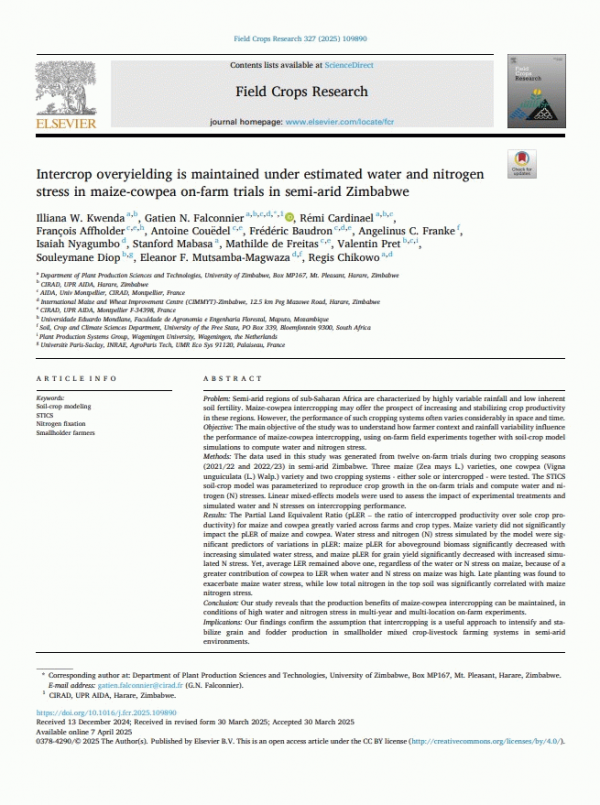 Problem: Semi-arid regions of sub-Saharan Africa are characterized by highly variable rainfall and low inherent soil fertility. Maize-cowpea intercropping may offer the prospect of increasing and stabilizing crop productivity in these regions. However, the performance of such cropping systems often varies considerably in space and time. Objective: The main objective of the study was to understand how farmer context and rainfall variability influence the performance of maize-cowpea intercropping, using on-farm field experiments together with soil-crop model simulations to compute water and nitrogen stress. Methods: The data used in this study was generated from twelve on-farm trials during two cropping seasons (2021/22 and 2022/23) in semi-arid Zimbabwe. Three maize (Zea mays L.) varieties, one cowpea (Vigna unguiculata (L.) Walp.) variety and two cropping systems - either sole or intercropped - were tested. The STICS soil-crop model was parameterized to reproduce crop growth in the on-farm trials and compute water and nitrogen (N) stresses. Linear mixed-effects models were used to assess the impact of experimental treatments and simulated water and N stresses on intercropping performance. Results: The Partial Land Equivalent Ratio (pLER – the ratio of intercropped productivity over sole crop productivity) for maize and cowpea greatly varied across farms and crop types. Maize variety did not significantly impact the pLER of maize and cowpea. Water stress and nitrogen (N) stress simulated by the model were significant predictors of variations in pLER: maize pLER for aboveground biomass significantly decreased with increasing simulated water stress, and maize pLER for grain yield significantly decreased with increased simulated N stress. Yet, average LER remained above one, regardless of the water or N stress on maize, because of a greater contribution of cowpea to LER when water and N stress on maize was high. Late planting was found to exacerbate maize water stress, while low total nitrogen in the top soil was significantly correlated with maize nitrogen stress. Conclusion: Our study reveals that the production benefits of maize-cowpea intercropping can be maintained, in conditions of high water and nitrogen stress in multi-year and multi-location on-farm experiments. Implications: Our findings confirm the assumption that intercropping is a useful approach to intensify and stabilize grain and fodder production in smallholder mixed crop-livestock farming systems in semi-arid environments.
