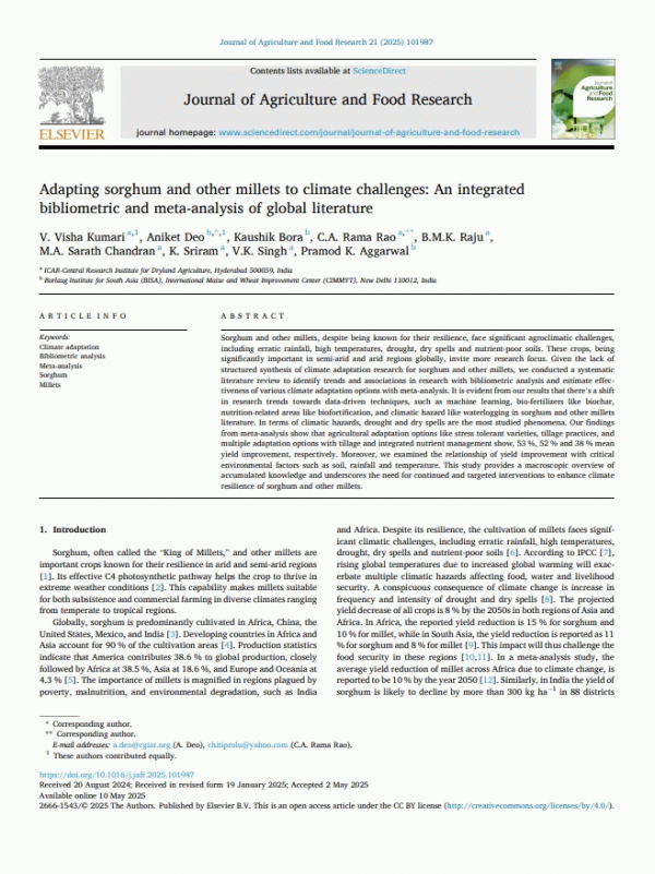 Subject(s): Online resources: In: Journal of Agriculture and Food Research Amsterdam (Netherlands) : Elsevier B.V., 2025. v. 21, art. 101987Summary: Sorghum and other millets, despite being known for their resilience, face significant agroclimatic challenges, including erratic rainfall, high temperatures, drought, dry spells and nutrient-poor soils. These crops, being significantly important in semi-arid and arid regions globally, invite more research focus. Given the lack of structured synthesis of climate adaptation research for sorghum and other millets, we conducted a systematic literature review to identify trends and associations in research with bibliometric analysis and estimate effectiveness of various climate adaptation options with meta-analysis. It is evident from our results that there's a shift in research trends towards data-driven techniques, such as machine learning, bio-fertilizers like biochar, nutrition-related areas like biofortification, and climatic hazard like waterlogging in sorghum and other millets literature. In terms of climatic hazards, drought and dry spells are the most studied phenomena. Our findings from meta-analysis show that agricultural adaptation options like stress tolerant varieties, tillage practices, and multiple adaptation options with tillage and integrated nutrient management show, 53 %, 52 % and 38 % mean yield improvement, respectively. Moreover, we examined the relationship of yield improvement with critical environmental factors such as soil, rainfall and temperature. This study provides a macroscopic overview of accumulated knowledge and underscores the need for continued and targeted interventions to enhance climate resilience of sorghum and other millets.