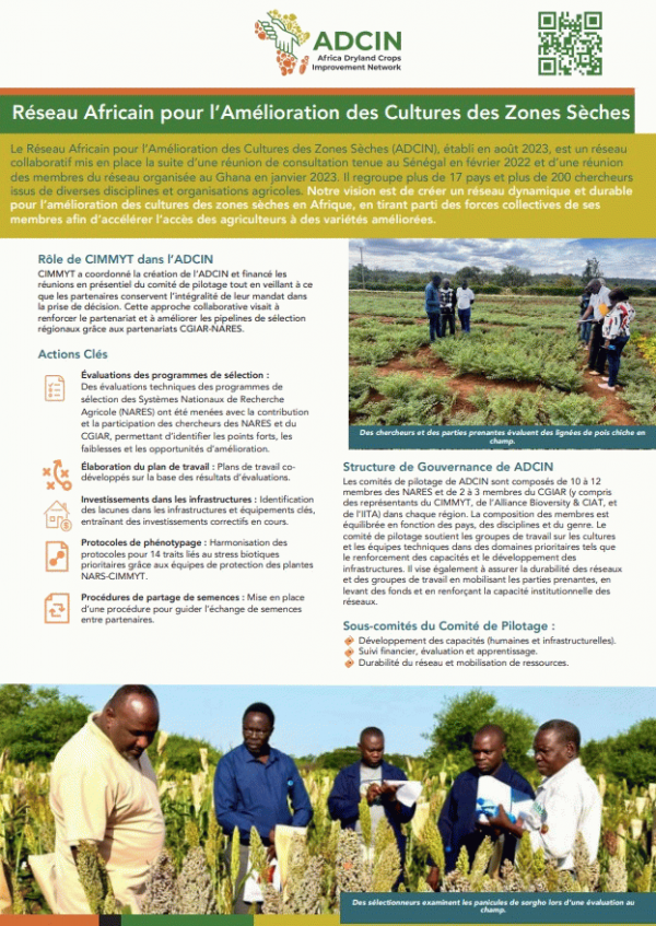 By: Contributor(s): Material type: Mixed materialsLanguage: French Publication details: [Mexico] : ADCIN, 2025.Description: 2 pagesSubject(s): Online resources: Summary: Le Réseau Africain pour l’Amélioration des Cultures des Zones Sèches (ADCIN), établi en août 2023, est un reseau collaboratif mis en place la suite d’une réunion de consultation tenue au Sénégal en février 2022 et d’une reunion des membres du réseau organisée au Ghana en janvier 2023. Il regroupe plus de 17 pays et plus de 200 chercheurs issus de diverses disciplines et organisations agricoles. Notre vision est de créer un réseau dynamique et durable pour l’amélioration des cultures des zones sèches en Afrique, en tirant parti des forces collectives de ses membres afin d’accélérer l’accès des agriculteurs à des variétés améliorées.