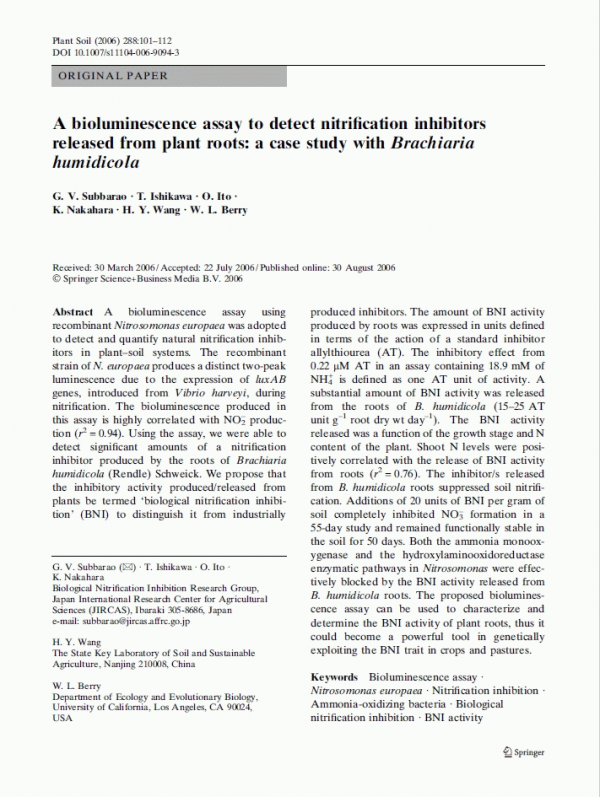 A bioluminescence assay using recombinant Nitrosomonas europaea was adopted to detect and quantify natural nitrification inhibitors in plant–soil systems. The recombinant strain of N. europaea produces a distinct two-peak luminescence due to the expression of luxAB genes, introduced from Vibrio harveyi, during nitrification. The bioluminescence produced in this assay is highly correlated with NO-2 production (r2 = 0.94). Using the assay, we were able to detect significant amounts of a nitrification inhibitor produced by the roots of Brachiaria humidicola (Rendle) Schweick. We propose that the inhibitory activity produced/released from plants be termed ‘biological nitrification inhibition’ (BNI) to distinguish it from industrially produced inhibitors. The amount of BNI activity produced by roots was expressed in units defined in terms of the action of a standard inhibitor allylthiourea (AT). The inhibitory effect from 0.22 μM AT in an assay containing 18.9 mM of NH+4 is defined as one AT unit of activity. A substantial amount of BNI activity was released from the roots of B. humidicola (15–25 AT unit g–1 root dry wt day–1). The BNI activity released was a function of the growth stage and N content of the plant. Shoot N levels were positively correlated with the release of BNI activity from roots (r2 = 0.76). The inhibitor/s released from B. humidicola roots suppressed soil nitrification. Additions of 20 units of BNI per gram of soil completely inhibited NO-3 formation in a 55-day study and remained functionally stable in the soil for 50 days. Both the ammonia monooxygenase and the hydroxylaminooxidoreductase enzymatic pathways in Nitrosomonas were effectively blocked by the BNI activity released from B. humidicola roots. The proposed bioluminescence assay can be used to characterize and determine the BNI activity of plant roots, thus it could become a powerful tool in genetically exploiting the BNI trait in crops and pastures.