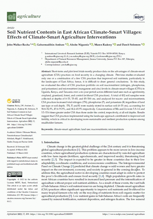 Subject(s): Online resources: In: Agriculture Switzerland : MDPI, 2022. v. 12, no. 4, art. 499Summary: Short-term and plot-level trials mostly produce data on the advantages of climate-smart agriculture (CSA) practices on food security in a changing climate. Previous studies evaluated only one or a combination of a few CSA practices that improved soil nutrients, particularly in the landscapes of East Africa; hence, it is difficult to draw general conclusions. In this study, we evaluated the effect of CSA practices portfolio on soil macronutrient (nitrogen, phosphorus, and potassium) and micronutrient (manganese and zinc) levels in climate-smart villages (CSVs) in Uganda, Kenya, and Tanzania over a six-year period across different land uses such as agroforestry, cropland, grassland, forest, and control (without CSA practices). A total of 432 soil samples were collected at depths of 0–15, 15–45, and 45–100 cm, and analyzed for macro- and micronutrients. CSA practices increased total nitrogen (TN), phosphorus (P), and potassium (K) regardless of land use type or soil depth. TN, P, and K were mainly stored in surface soil (0–15 cm), accounting for 50.8–52.5%, 47.0–79.5%, and 34.2–65.5% respectively. Concentrations of Mn and Zn were 1.5–3.6 and 5.1–15.6 times greater under CSA than those under the control, respectively, at all soil depths. Results suggest that CSA practices implemented using the landscape approach contributed to improved soil fertility, which is critical in developing more sustainable and resilient production systems among smallholder farmers.