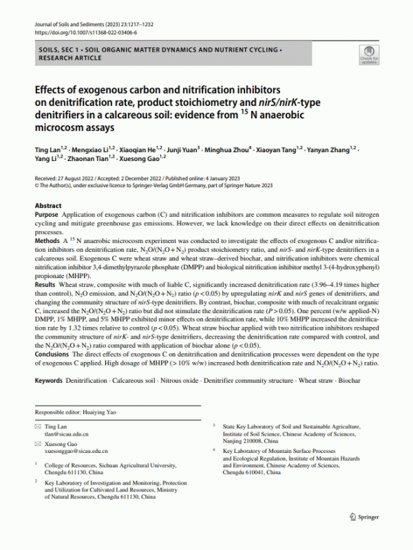 Subject(s): In: Journal of Soils and Sediments Germany : Springer, 2023. v. 338, art. 139611Summary: Purpose: Application of exogenous carbon (C) and nitrification inhibitors are common measures to regulate soil nitrogen cycling and mitigate greenhouse gas emissions. However, we lack knowledge on their direct effects on denitrification processes. Methods: A 15 N anaerobic microcosm experiment was conducted to investigate the effects of exogenous C and/or nitrification inhibitors on denitrification rate, N2O/(N2O + N2) product stoichiometry ratio, and nirS- and nirK-type denitrifiers in a calcareous soil. Exogenous C were wheat straw and wheat straw–derived biochar, and nitrification inhibitors were chemical nitrification inhibitor 3,4-dimethylpyrazole phosphate (DMPP) and biological nitrification inhibitor methyl 3-(4-hydroxyphenyl) propionate (MHPP). Results: Wheat straw, composite with much of liable C, significantly increased denitrification rate (3.96–4.19 times higher than control), N2O emission, and N2O/(N2O + N2) ratio (p < 0.05) by upregulating nirK and nirS genes of denitrifiers, and changing the community structure of nirS-type denitrifiers. By contrast, biochar, composite with much of recalcitrant organic C, increased the N2O/(N2O + N2) ratio but did not stimulate the denitrification rate (P > 0.05). One percent (w/w applied-N) DMPP, 1% MHPP, and 5% MHPP exhibited minor effects on denitrification rate, while 10% MHPP increased the denitrification rate by 1.32 times relative to control (p < 0.05). Wheat straw biochar applied with two nitrification inhibitors reshaped the community structure of nirK- and nirS-type denitrifiers, decreasing the denitrification rate compared with control, and the N2O/(N2O + N2) ratio compared with application of biochar alone (p < 0.05). Conclusions: The direct effects of exogenous C on denitrification and denitrification processes were dependent on the type of exogenous C applied. High dosage of MHPP (> 10% w/w) increased both denitrification rate and N2O/(N2O + N2) ratio.