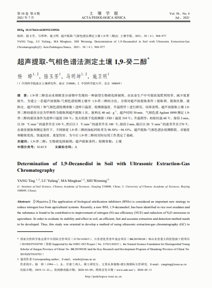 [Objective] The application of biological nitrification inhibitors (BNIs) is considered an important new strategy to reduce nitrogen loss from agricultural systems. Recently, a new BNI, 1,9-decanediol, has been identified in rice root exudates and the substance is found to be contributive to improvement of nitrogen (N)-use efficiency (NUE) and reduction of N2O emissions in agriculture. In order to evaluate its stability and effect in soil, an efficient, fast and accurate extraction and detection method needs to be developed. Thus, this study was oriented to develop a method of using ultrasonic extraction-gas chromatography (GC) to determine 1,9-decanediol in soil.[Method] Soil samples were collected from a paddy soil at Yixing (31°17' N, 119°54' E), Jiangsu Province of China for extraction of 1,9-decanediol using different methods, including different extractants (water, acetonitrile, methanol, acetone, ethyl acetate, dichloromethane, hexane, and petroleum ether), different liquid to solid ratios (varying in the range of 10-50 mL·g-1), different durations of ultrasonic processing (in the range of 10-50 min), different frequency of extraction (in the range of 1-3 times), and different gas chromatography detection parameters, including inlet temperature (in the range of 200-280℃), detector temperature(in the range of 260-320℃), and four heating procedures for optimization. Spike recovery of the substance in soil was determination relative to its concentration (10, 100 and 1 000 mg kg-1).[Result] Results show that:(1) the method of ultrasonic extraction using methanol as extractant, 40 mL·g-1 in liquid/solid ratio, and going only one round that lasted 30 min was the optimal one; (2) In using the Agilent 8890 gas chromatographer to determine the substance, the optimal conditions were 250 ℃ at the inlet, 310 ℃ at the FID detector, 60 ℃ in the column kept for the first 2 min, and then raised up to 150 ℃ at 20 ℃·min-1 and to 180℃ at 3℃·min-1, kept for 2 min. and in the end, raised to 270 ℃ at 20℃·min-1; (3) under such conditions, determination of 1,9-decanediol, 10-100.00 μg·mL-1 in concentration exhibited good linearity, standard curve of y=26.81x-9.678(R2=0.999), detection limit of 0.03 μg·mL-1, recovery rate of 93.99%-96.91%, intraday precision 1.78% and interday precision of 1.52%; and (4) under such optimal extraction and determination conditions, the spike recovery rate of 1, 9-decanediol in soil samples, regardless of concentration, varied in the range of 90.58%-94.55% with relative standard deviation(RSD)varying in the range of 0.30%-3.41%.[Conclusion] This method, low in detection limit, high in sensitivity and precision, and good in reproducibility, and this experiment may lay down a foundation for evaluation of stability and environmental impacts of 1, 9-decanediol in agricultural soils, and provide a good reference for developing methods for extracting other BNIs in soil in future.