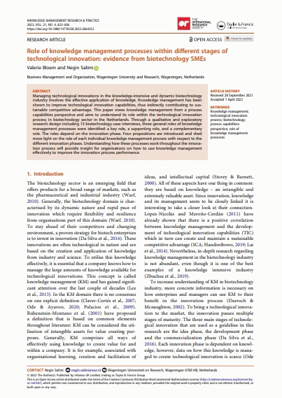 Role of knowledge management processes within different stages of technological innovation : evidence from biotechnology SMEs