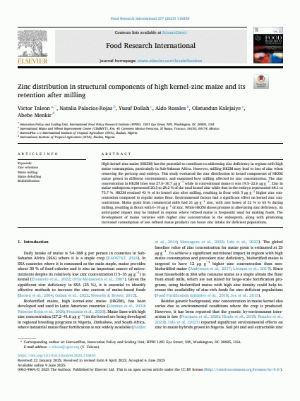 High kernel-zinc maize (HKZM) has the potential to contribute to addressing zinc deficiency in regions with high maize consumption, particularly in Sub-Saharan Africa. However, milling HKZM may lead to loss of zinc when removing the pericarp and embryo. This study evaluated the zinc distribution in kernel components of HKZM maize grown in different environments, and examined how milling affected its zinc concentration. The zinc concentration in HKZM lines was 27.0-30.7 mu g g-1 while in conventional maize it was 19.5-22.6 mu g g-1. Zinc in maize endosperm represented 20.5 to 28.2 % of the total kernel zinc while that in the embryo represented 68.1 to 75.7 %. HKZM retained 43 % of its kernel zinc after milling, resulting in flour with 5 mu g g-1 higher zinc concentration compared to regular maize flour. Environmental factors had a significant effect on kernel zinc concentrations. Maize grain from commercial mills had 21 mu g g-1 zinc, with zinc losses of 22 % to 65 % during milling, resulting in flours with 6-10 mu g g-1 of zinc. While HKZM shows promise in alleviating zinc deficiency, its anticipated impact may be limited in regions where refined maize is frequently used for making foods. The development of maize varieties with higher zinc concentration in the endosperm, along with promoting increased consumption of less refined maize products can boost zinc intake for deficient populations.