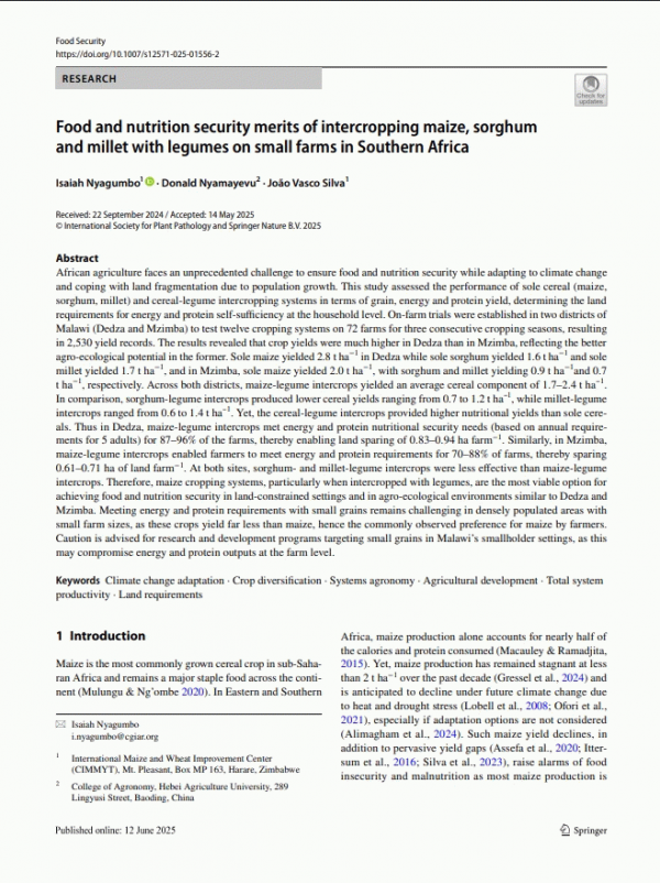 Subject(s): In: Food Security Netherlands : International Society for Plant Pathology ; Springer Nature B.V., 2025. In pressSummary: African agriculture faces an unprecedented challenge to ensure food and nutrition security while adapting to climate change and coping with land fragmentation due to population growth. This study assessed the performance of sole cereal (maize, sorghum, millet) and cereal-legume intercropping systems in terms of grain, energy and protein yield, determining the land requirements for energy and protein self-sufficiency at the household level. On-farm trials were established in two districts of Malawi (Dedza and Mzimba) to test twelve cropping systems on 72 farms for three consecutive cropping seasons, resulting in 2,530 yield records. The results revealed that crop yields were much higher in Dedza than in Mzimba, reflecting the better agro-ecological potential in the former. Sole maize yielded 2.8 t ha−1 in Dedza while sole sorghum yielded 1.6 t ha−1 and sole millet yielded 1.7 t ha−1, and in Mzimba, sole maize yielded 2.0 t ha−1, with sorghum and millet yielding 0.9 t ha−1and 0.7 t ha−1, respectively. Across both districts, maize-legume intercrops yielded an average cereal component of 1.7–2.4 t ha⁻1. In comparison, sorghum-legume intercrops produced lower cereal yields ranging from 0.7 to 1.2 t ha⁻1, while millet-legume intercrops ranged from 0.6 to 1.4 t ha⁻1. Yet, the cereal-legume intercrops provided higher nutritional yields than sole cereals. Thus in Dedza, maize-legume intercrops met energy and protein nutritional security needs (based on annual requirements for 5 adults) for 87–96% of the farms, thereby enabling land sparing of 0.83–0.94 ha farm−1. Similarly, in Mzimba, maize-legume intercrops enabled farmers to meet energy and protein requirements for 70–88% of farms, thereby sparing 0.61–0.71 ha of land farm−1. At both sites, sorghum- and millet-legume intercrops were less effective than maize-legume intercrops. Therefore, maize cropping systems, particularly when intercropped with legumes, are the most viable option for achieving food and nutrition security in land-constrained settings and in agro-ecological environments similar to Dedza and Mzimba. Meeting energy and protein requirements with small grains remains challenging in densely populated areas with small farm sizes, as these crops yield far less than maize, hence the commonly observed preference for maize by farmers. Caution is advised for research and development programs targeting small grains in Malawi’s smallholder settings, as this may compromise energy and protein outputs at the farm level.