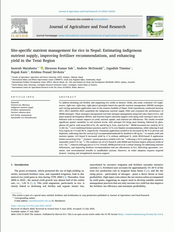 To address declining soil fertility and stagnating rice yields in farmers' fields, this study evaluated 4-R (right-source, right-rate, right-time, right-place) principles based site-specific nutrient management (SSNM) strategies and varying potassium application rates in the western foothills of Nepal. Field experiments conducted between 2011–2013 and2022–2023 quantified the indigenous nutrient supply (INS) and evaluated the performance of SSNM strategies. These strategies incorporated real-time nitrogen management using leaf color charts (LCC), soil plant analysis development (SPAD), and Nutrient Expert (decision support tool) along with varying K rates on K-deficient soils to evaluate impacts on yield, nutrient uptake, and nutrient-use efficiencies. The results revealed significant spatial variability in soil nutrient levels, with nitrogen (N) being most limiting, followed by phosphorus (P) and K, with mean INS of 53, 29, and 84 kg N, P2O5, and K2O ha-1. SSNM increased rice yield by 36 % (1.68 t ha−1) over traditional farmer practices and by 12 % over blanket recommendations, while reducing N and P2O5 inputs by 4 % and 28 %, respectively. Potassium application needed to be increased by 80 % to prevent soil depletion, indicating that the current K2O recommendationshould be doubled to 80 kg ha−1 to sustain yield and nutrient uptake. LCC-based N increased yield by 4 % without additional N, while SPAD-based N application further saved 8 kg N ha−1. Farmers' current practices yielded 4.69 t ha−1 reflecting a 33 % yield gap compared to attainable yield (7.0 t ha−1). The combine use of LCC-based N with SSNM and Nutrient Expert achieved yields of 6.61 t ha−1, reduced yield gap just to 5.5 %. Overall, SSNM proved to be a robust strategy for addressing nutrient deficiencies, and improving fertilizer recommendation and use effeciencies in rice, delivering agronomic, economic, and environmental benefits to smallholder systems. However, its wider adoption requires targeted farmers’ training and strengthened extension support.