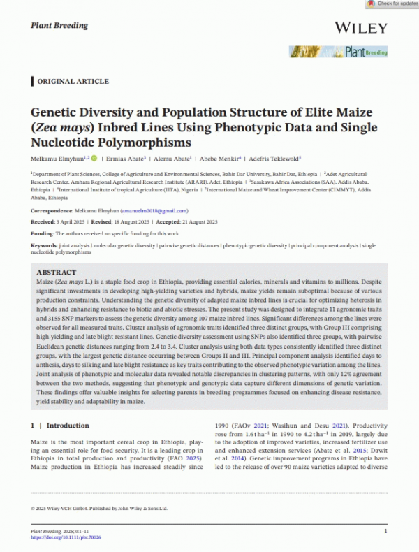 Maize (Zea mays L.) is a staple food crop in Ethiopia, providing essential calories, minerals and vitamins to millions. Despite significant investments in developing high-yielding varieties and hybrids, maize yields remain suboptimal because of various production constraints. Understanding the genetic diversity of adapted maize inbred lines is crucial for optimizing heterosis in hybrids and enhancing resistance to biotic and abiotic stresses. The present study was designed to integrate 11 agronomic traits and 3155 SNP markers to assess the genetic diversity among 107 maize inbred lines. Significant differences among the lines were observed for all measured traits. Cluster analysis of agronomic traits identified three distinct groups, with Group III comprising high-yielding and late blight-resistant lines. Genetic diversity assessment using SNPs also identified three groups, with pairwise Euclidean genetic distances ranging from 2.4 to 3.4. Cluster analysis using both data types consistently identified three distinct groups, with the largest genetic distance occurring between Groups II and III. Principal component analysis identified days to anthesis, days to silking and late blight resistance as key traits contributing to the observed phenotypic variation among the lines. Joint analysis of phenotypic and molecular data revealed notable discrepancies in clustering patterns, with only 12% agreement between the two methods, suggesting that phenotypic and genotypic data capture different dimensions of genetic variation. These findings offer valuable insights for selecting parents in breeding programmes focused on enhancing disease resistance, yield stability and adaptability in maize.