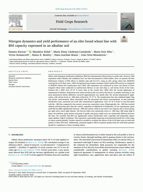 Subject(s): In: Field Crops Research Netherlands : Elsevier B.V., 2025 v. 334, art. 110172Summary: Wheat with biological nitrification inhibition (BNI) has demonstrated effectiveness in acidic soils. However, BNI expression under alkaline soil conditions have not been documented in field studies. Here, we present the first field-based evidence of BNI effects in alkaline soils (pH 8.6-8.7), using an elite spring wheat line (ROELFS) carrying the Lr#N short arm (+BNI) introgressed from Leymus racemosus which confers BNI activity as compared to ROELFS without the translocation arm (-BNI). BNI expression was evidenced by lower soil nitrate in three irrigated wheat trials conducted in northwestern Mexico. In one trial (Exp 1), soil nitrate levels of the translocation line (+BNI) were 24-37 % lower than in the control line (-BNI) after the second application of ammonium-N fertilizer. Reductions were observed both in the row and in the furrow. In another trial (Exp 3), the most pronounced nitrate difference occurred approximately one month after the second ammonium-N application, with nitrate levels in +BNI plots reduced by 73-77 %. The translocation line also exhibited higher flag leaf nitrate concentrations, likely associated with the decreased soil nitrate concentrations. In vitro potential nitrification rates, measured one week after ammonium-N application, were 27-32 % lower in soil associated with the +BNI line compared to the control, across two consecutive years. Phenologically, the +BNI line reached anthesis and flowering later than the control, regardless of additional N fertilization. In two experiments, grain yield did not differ significantly between +BNI and control, while in one trial it was reduced, due to fewer grains per spike and a lower spike density. The harvest index was consistently lower in +BNI than -BNI under high N input. Nevertheless, grain protein and grain N uptake and grain weight were not statistically different between the lines. We conclude that BNI can significantly reduce nitrification with a spatially and temporally impact under alkaline, high N conditions. This represents a potentially important environmental benefit for a wide range of wheat systems globally. Further research is needed to evaluate the effects of the Lr#N short arm on yield and quality in other elite lines. Additionally, potential negative effects on gluten quality from the wild donor genome should be considered in future breeding efforts.