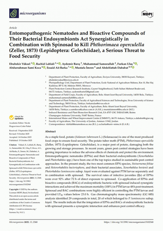Entomopathogenic nematodes and bioactive compounds of their bacterial endosymbionts act synergistically in combination with spinosad to kill Phthorimaea operculella (Zeller, 1873) (Lepidoptera : Gelechiidae), a serious threat to food security