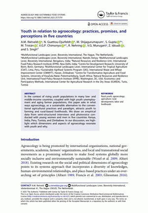 In the context of rising youth populations in many low- and middle-income countries, coupled with high youth unemployment and aging farmer populations, this paper asks in what ways agroecology, as a sustainable alternative to the conventional agricultural practices and paradigm, attracts youth to farming and rural-based livelihoods. We draw on empirical data from semi-structured interviews and photovoice conducted with young women and men in five countries: Kenya, India, Peru, Tunisia, and Zimbabwe. In our discussion, we highlight which dimensions and aspects of agroecology resonate with youth and why.