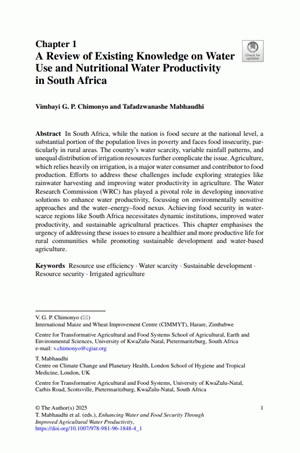 Subject(s): Online resources: In: Enhancing water and food security through improved agricultural water productivity : new knowledge, innovations and applications Singapore : Springer Nature, 2025. p. 1-29Summary: In South Africa, while the nation is food secure at the national level, a substantial portion of the population lives in poverty and faces food insecurity, particularly in rural areas. The country’s water scarcity, variable rainfall patterns, and unequal distribution of irrigation resources further complicate the issue. Agriculture, which relies heavily on irrigation, is a major water consumer and contributor to food production. Efforts to address these challenges include exploring strategies like rainwater harvesting and improving water productivity in agriculture. The Water Research Commission (WRC) has played a pivotal role in developing innovative solutions to enhance water productivity, focussing on environmentally sensitive approaches and the water–energy–food nexus. Achieving food security in water-scarce regions like South Africa necessitates dynamic institutions, improved water productivity, and sustainable agricultural practices. This chapter emphasises the urgency of addressing these issues to ensure a healthier and more productive life for rural communities while promoting sustainable development and water-based agriculture.