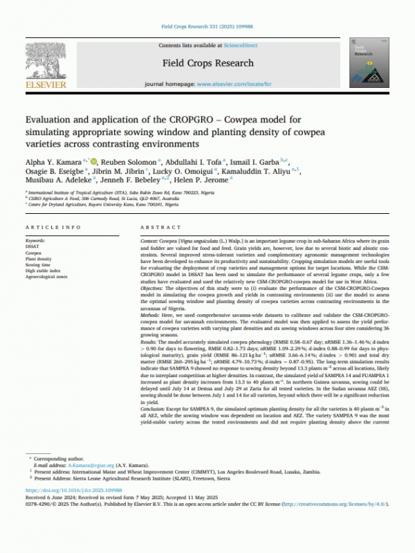 Subject(s): In: Field Crops Research Netherlands : Elsevier B.V., 2025. v. 331, art. 109988Summary: Context: Cowpea [Vigna unguiculata (L.) Walp.] is an important legume crop in sub-Saharan Africa where its grain and fodder are valued for food and feed. Grain yields are, however, low due to several biotic and abiotic constraints. Several improved stress-tolerant varieties and complementary agronomic management technologies have been developed to enhance its productivity and sustainability. Cropping simulation models are useful tools for evaluating the deployment of crop varieties and management options for target locations. While the CSM-CROPGRO model in DSSAT has been used to simulate the performance of several legume crops, only a few studies have evaluated and used the relatively new CSM-CROPGRO-cowpea model for use in West Africa. Objectives: The objectives of this study were to (i) evaluate the performance of the CSM-CROPGRO-Cowpea model in simulating the cowpea growth and yields in contrasting environments (ii) use the model to assess the optimal sowing window and planting density of cowpea varieties across contrasting environments in the savannas of Nigeria. Methods: Here, we used comprehensive savanna-wide datasets to calibrate and validate the CSM-CROPGRO-cowpea model for savannah environments. The evaluated model was then applied to assess the yield performance of cowpea varieties with varying plant densities and six sowing windows across four sites considering 36 growing seasons. Results: The model accurately simulated cowpea phenology (RMSE 0.58–0.67 day; nRMSE 1.36–1.46 %; d-index > 0.90 for days to flowering, RMSE 0.82–1.73 days; nRMSE 1.09–2.29 %; d-index 0.88–0.99 for days to physiological maturity), grain yield (RMSE 86–121 kg ha−1; nRMSE 3.66–6.14 %; d-index > 0.90) and total dry matter (RMSE 260–295 kg ha−1; nRMSE 4.79–10.73 %; d-index = 0.87–0.95). The long-term simulation results indicate that SAMPEA 9 showed no response to sowing density beyond 13.3 plants m–2 across all locations, likely due to interplant competition at higher densities. In contrast, the simulated yield of SAMPEA 14 and FUAMPEA 1 increased as plant density increases from 13.3 to 40 plants m⁻². In northern Guinea savanna, sowing could be delayed until July 14 at Demsa and July 29 at Zaria for all tested varieties. In the Sudan savanna AEZ (SS), sowing should be done between July 1 and 14 for all varieties, beyond which there will be a significant reduction in yield. Conclusion: Except for SAMPEA 9, the simulated optimum planting density for all the varieties is 40 plants m–2 in all AEZ, while the sowing window was dependent on location and AEZ. The variety SAMPEA 9 was the most yield-stable variety across the tested environments and did not require planting density above the current industry recommendations of 13.3 plants m−2. This study could fill the knowledge gap in understanding optimal cowpea management opportunities needed to maximize productivity and strengthen cropping resilience.