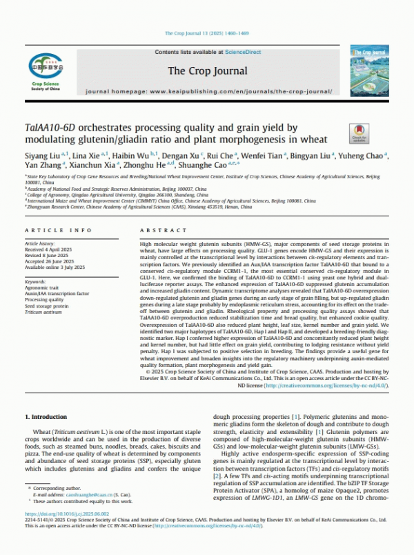 TaIAA10-6D orchestrates processing quality and grain yield by modulating glutenin/gliadin ratio and plant morphogenesis in wheat