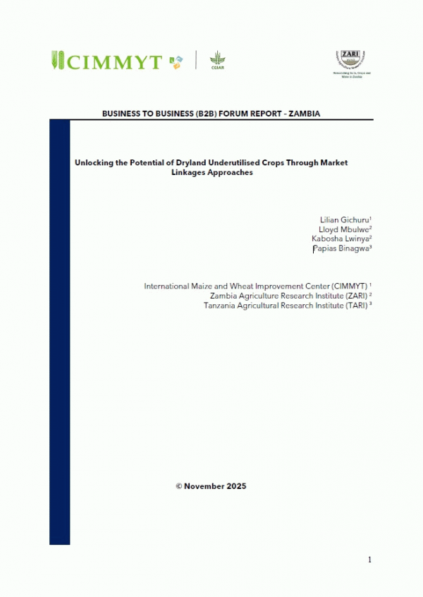 By: Contributor(s): Material type: TextLanguage: English Publication details: [Zambia] : CIMMYT : ZARI, 2025.Description: 33 pagesSubject(s): Online resources: Summary: Zambia’s dryland underutilized crops, including sorghum, millets, cowpeas, groundnuts, and pigeon peas, present a transformative opportunity to enhance food security, climate resilience, and economic growth in the country’s semi-arid regions. These drought-tolerant, nutrient-rich crops are well-adapted to thrive in marginal environments where staple crops like maize struggle, yet they remain undervalued due to policy gaps, limited market access, and low awareness of their benefits. The Business-to-Business (B2B) Forum on dryland crops, held in Zambia, Lusaka on 22nd October 2025, brought together stakeholders from research institutions, government, the private sector, and farmer organizations to discuss these challenges and catalyse investment and partnerships. Drylands crops discussed in this forum are known to be inherently resilient to water scarcity, making them ideal for climate change adaptation in regions with erratic rainfall. They are also nutrient dense (protein, vitamins (A and C), minerals (iron, calcium), dietary fibre) offering a solution to malnutrition and dietary diversity. Economically, scaling up their cultivation and use could boost rural incomes, create jobs across value chains (from production to processing), and spur industrial growth. Despite these benefits, the crops face significant hurdles: low adoption of improved varieties, fragmented value chains, inadequate storage and processing infrastructure, and policy biases. To unlock the potential of these crops, the forum recommended six priority actions: (1) Strengthen Research & Development by investing in breeding, agronomic research, and value chain analysis to develop region-specific varieties; (2) Enhance Policy Support through national strategies, subsidies, and inclusion in food programs; (3) Boost Market Linkages by facilitating partnerships between farmers, processors, and buyers, and improving infrastructure; (4) Build Capacity by training farmers on climate-smart practices and business skills; (5) Raise Awareness through campaigns to promote their nutritional and environmental benefits; and (6) Mobilize Investment via public-private partnerships and donor funding. Immediate next steps include developing policy briefs to integrate these crops into Zambia’s agricultural strategies, organizing follow-up stakeholder meetings to create action plans, piloting community processing hubs, distributing improved seeds, and establishing a multi-stakeholder platform to track progress. By scaling up these “forgotten crops,” Zambia can achieve food security, improve livelihoods, and build a climate-resilient agricultural system. The forum emphasized that coordinated efforts can transform these underutilized crops into drivers of sustainable development, ensuring a more prosperous and resilient future for Zambian communities.
