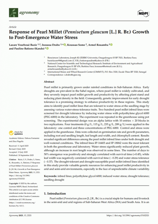 Subject(s): Online resources: In: Agronomy Basel (Switzerland) : MDPI, 2025. v. 15, no. 10, art. 2321Summary: Pearl millet is primarily grown under rainfed conditions in Sub-Saharan Africa. Early droughts are prevalent in the Sahel region, where pearl millet is widely cultivated, and they severely impact pearl millet growth and productivity by affecting plant stand and reducing plant density in the field. Consequently, genetic improvement for early drought tolerance is a promising strategy to enhance productivity in these regions. This study aims to identify pearl millet lines that are tolerant to water stress at the seedling stage by assessing various water-stress-tolerance traits. Two hundred pearl millet inbred lines were screened for drought tolerance by inducing water stress with polyethylene glycol 6000 (PEG 6000) in the laboratory. The experiment was repeated in the greenhouse using pot screening. The experimental design was an alpha lattice with 10 entries × 20 blocks in two replications. Four treatments (0 g/L, 115 g/L, 235 g/L, 289 g/L) were applied in the laboratory: one control and three concentrations of PEG 6000. Control and stress were applied in the greenhouse. Data were collected on germination rate and growth parameters, including root and seedling length, leaf length and width, and chlorophyll content. Results revealed significant differences among the pearl millet inbred lines under both drought and well-watered conditions. The inbred lines IP-16403 and IP-18062 were the most tolerant in both the greenhouse and laboratory. Water stress significantly reduced plant growth, although an increase in root length was observed in some lines. The number of days to 50% emergence was positively and strongly correlated with survival time (+0.45), while leaf width was negatively correlated with survival time (−0.29) and water stress tolerance (−0.37). The drought-tolerant and drought-susceptible pearl millet inbred lines identified in this study provide valuable genetic resources for enhancing pearl millet productivity in arid and semi-arid environments, especially in the face of unpredictable climate variability.