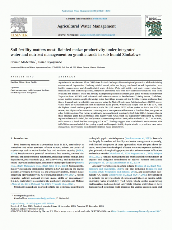 Subject(s): Online resources: In: Agricultural Water Management Amsterdam (Netherlands) : Elsevier B.V., 2026. v. 323, art. 110093Summary: Agriculture in sub-Saharan Africa (SSA) faces the dual challenge of increasing food production while minimizing environmental degradation. Declining rainfed cereal yields are largely attributed to soil degradation, poor fertility management, and drought-related water deficits. While soil fertility and water conservation have traditionally been studied separately, integrated approaches may offer more sustainable solutions. This study evaluated the effects of water and fertility management practices on maize grain yield, Normalized Difference Vegetation Index (NDVI), and volumetric soil moisture content at Domboshawa Training Centre, Zimbabwe, across multiple seasons. A split-plot design tested four tillage systems and four fertility regimes, replicated four times. Seasonal water availability was assessed using the Water Requirement Satisfaction Index (WRSI), where values above 50 % indicate sufficient moisture for maize growth. WRSI values ranged from 38 % to 69 %, with the highest rainfall and crop performance in the 2011/12 season. NDVI values peaked at 0.6 in the 2015/16 season, also higher under treatments combining water management with manure + basal fertiliser, compared to other fertility options. Tied ridging significantly increased topsoil moisture by 36.5 % in 2013/14 season, though these moisture gains did not translate into higher yields. Grain yield was significantly influenced by fertility regime and seasonal rainfall, but not by water conservation practices. Peak yields reached 4.6 t ha−1 in 2013/14, with manure + basal fertiliser averaging 4.3 t ha−1. Findings suggest that in sub-humid environments with 600–800 mm annual rainfall, integrating organic and inorganic fertility inputs, should be prioritized over water management interventions to sustainably improve maize productivity.