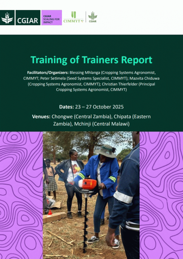 TextLanguage: English Publication details: [Mexico] : CIMMYT, 2025.Description: 18 pagesSubject(s): Online resources: Summary: As part of CIMMYT’s contribution to the Scaling for Impact (S4I) Initiative, a Training of Trainers (ToT) was conducted from 23–27 October 2025 to strengthen partner capacity for the scaling of bundled soil, water, mechanization, and seed system innovations. The training was delivered in conjunction with the Water & Soil Accelerator (WASA), which served as a primary implementation and learning platform for testing and refining scalable solutions. The training targeted technical, research, and extension staff from Conservation Farming Unit (CFU), Total LandCare (TLC), Foundation for Farming (FoF), and collaborating institutions, including the African Fertilizer and Agribusiness Partnership (AFAP), Pelum, and the Ministry of Agriculture in Zambia and Malawi. The overall objective was to strengthen system readiness for scaling by equipping partners with practical skills to implement, adapt, and monitor standardized innovation bundles, including: i. Conservation Agriculture (CA) practices; ii. Small-scale mechanization using basin diggers; iii. Legume seed multiplication and quality assurance; and iv. Robust agronomic and implementation data systems. Three training sessions were conducted: i. Session 1: Chongwe District, Central Zambia – CFU (16 participants; 38% women; 44% youth); ii. Session 2: Msekera Research Station, Eastern Zambia – TLC & FoF (7 participants; 29% women; 43% youth); iii. Session 3: Mchinji District, Malawi – TLC, AFAP, Pelum, Ministry of Agriculture (22 participants; 27% women; 22% youth). Across all sessions, 45 participants (31% women; 36% youth) were trained through a combination of classroom instruction, hands-on field implementation, and peer learning. While WASA protocols and demonstration sites were used as the operational backbone, the training explicitly focused on scaling functions central to S4I, including partner capacity, data systems, implementation fidelity, contextual adaptation, and coordination across institutions. The training contributes directly to CGIAR Impact Areas, particularly: i. Climate adaptation and mitigation (improved soil water management and resilience); ii. Environmental health and biodiversity (soil cover, residue retention, diversified systems); iii. Poverty reduction, livelihoods, and jobs (mechanization service opportunities); and iv. Gender equality, youth, and social inclusion (deliberate inclusion and leadership pathways).