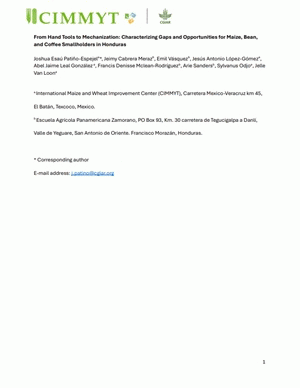 AgriRxiv Wallingford (United Kingdom) : CABI, 2026. PreprintSummary: This study characterized agricultural mechanization and identified the main challenges and opportunities for maize, bean and coffee production systems across five departments in Honduras: Lempira, Copán, Intibucá, Olancho and El Paraíso. A total of 112 surveys were conducted, and four focus groups were held among farmers. The surveys gathered information on production systems and types of tools used, while focus groups explored perceptions of farmers about the challenges and mechanization needs. The farmers surveyed grow maize (95.5%), bean (92.9%), and coffee (38.4%), on areas smaller than 1 ha for maize and bean (73%) and from 1 to 5 ha for coffee (51.2%), located on hillsides, plains, and mixed terrain. The use of motorized tools varied greatly between sites and crops (0-65.1%), while the use of hand tools was reported by almost all respondents (90.7 95.2%). Overall, the tools present in all sites and crops were found to be manual, such as machetes (almost 100%) and hoes (50-100%), planting sticks for corn and bean (65%), and post hole diggers for coffee (81.4%). Lowest levels of mechanization occurred in harvesting and post-harvesting, although some machinery for post-harvest coffee processing was present. In western departments, maize shelling and bean threshing are mainly performed manually (up to 90.9%), while in eastern departments a higher usage of mechanical threshers/shellers was observed (up to 85%). The major challenges for production systems reported are the labor shortage, high equipment costs, lack of financing mechanisms, and the need for mechanization solutions adapted to local conditions. The findings suggest that an efficient transformation of production systems in these regions demands scale-appropriate mechanized solutions, paired with strategies that enable a transition from entirely manual tools to small equipment that reduces physical effort of farmers.
