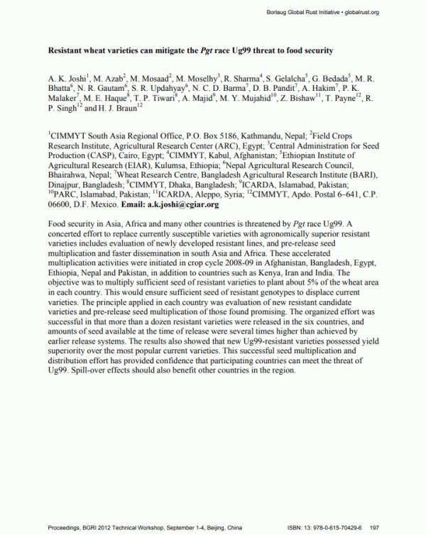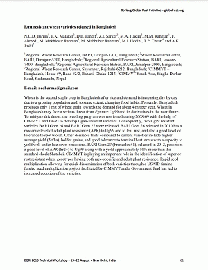 BGRI (Borlaug Global Rust Initiative) 2013 Technical Workshop; New Delhi (India); 19-22 Aug 2013; Posters: Adoption or Rust Resistant Wheat New Delhi (India) : BGRI, 2013. p. 61