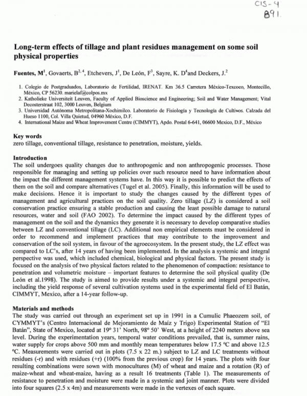 La importancia del manejo de los residuos del cultivo para mantener la calidad del suelo en sistemas de cultivo con cero labranza; Una comparación entre ensayos a largo plazo en sistemas de cultivo de trigo de temporal y de riego by
